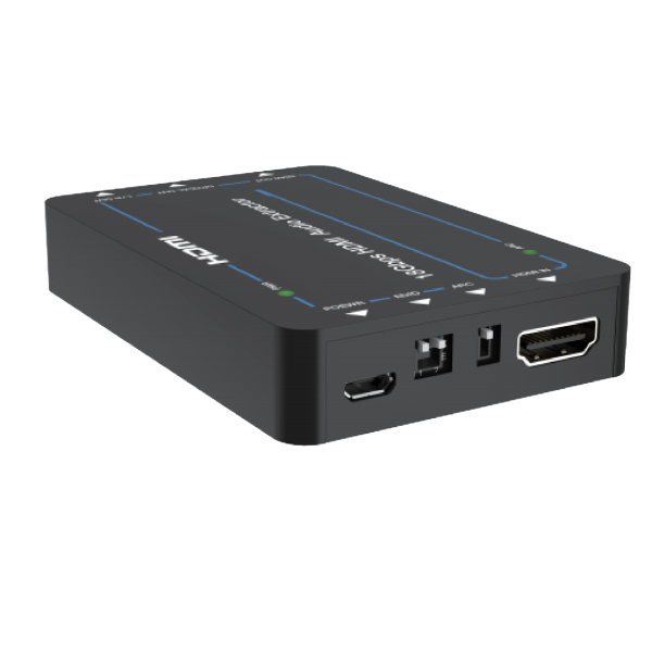This 18 Gpbs HDMI Audio Extractor can extract audio signals from the HDMI source to output to A/V receivers via the Optical port and L/R analog audio port. The device also has a built-in HDMI output port which can connect to an ARC-compatible display and return the received audio to the amplifier or speaker via the optical port when the ARC is enabled. The input and output video resolution can reach up to 4K×2K@60Hz (YUV 4:4:4). The product supports smart EDID management, and both EDID and ARC functions can be controlled via DIP switches on the front panel.